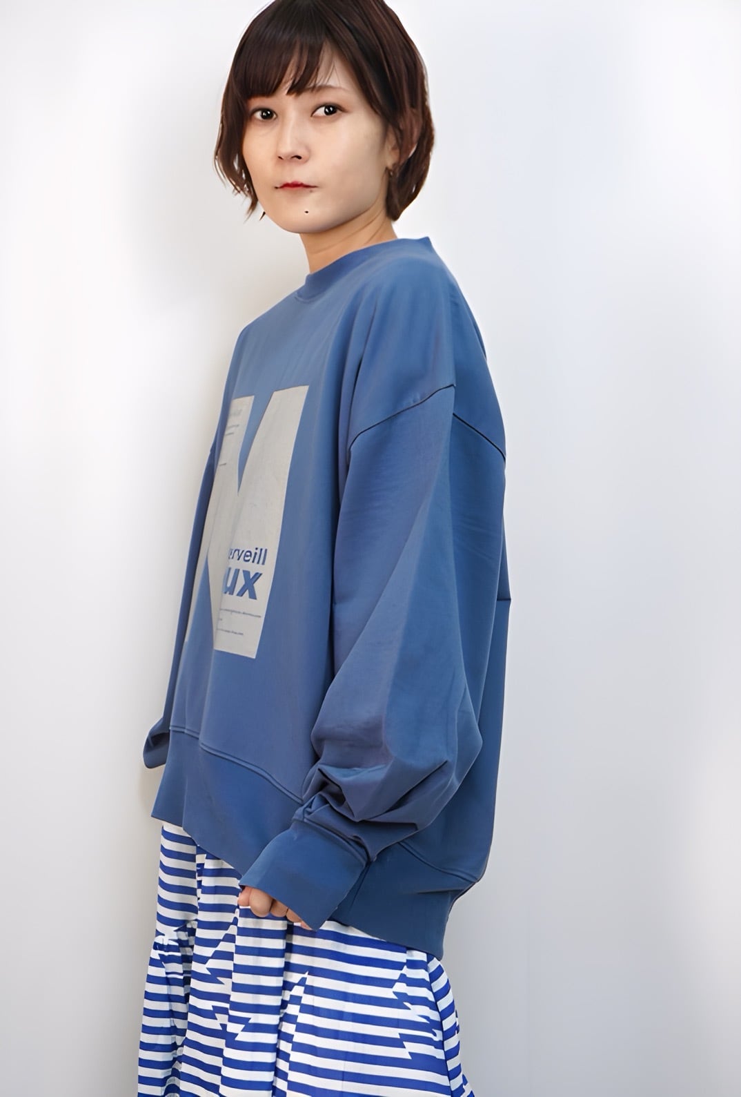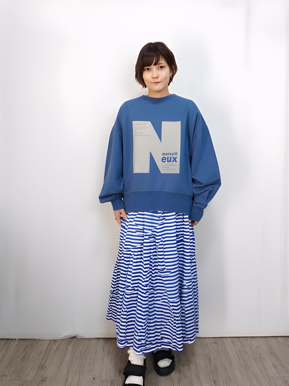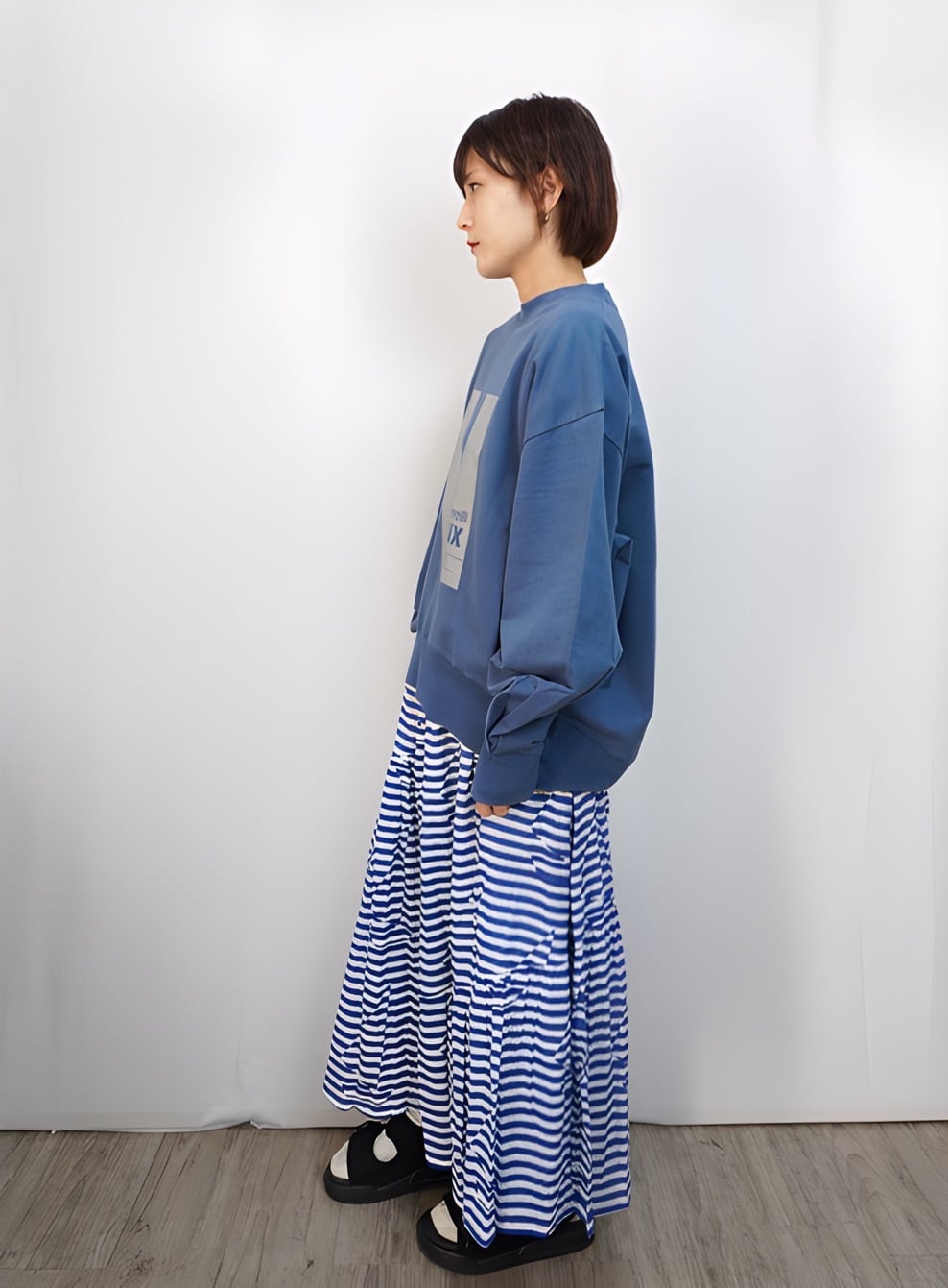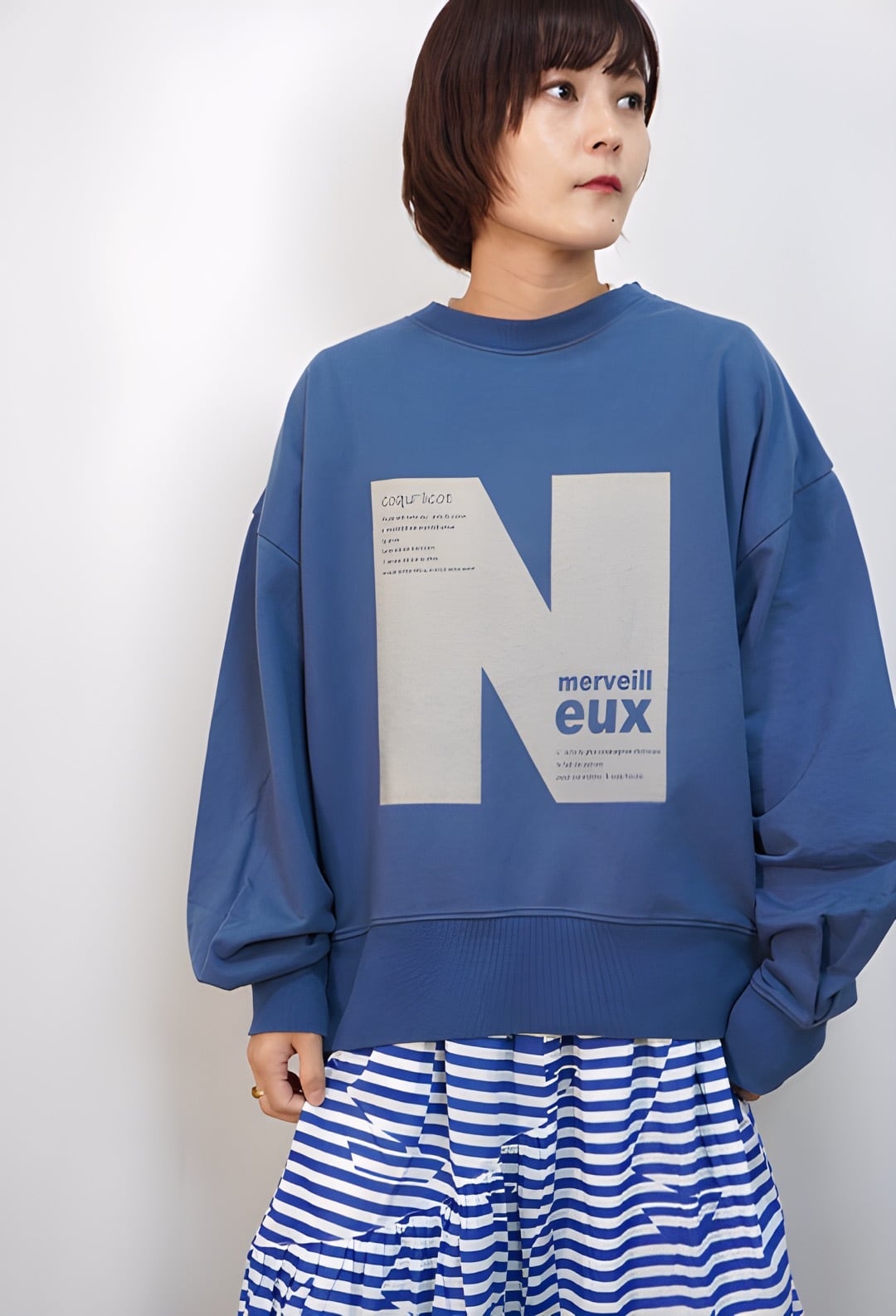 着用モデル:身長154㎝ 着用カラー:70Blue・13Gray杢